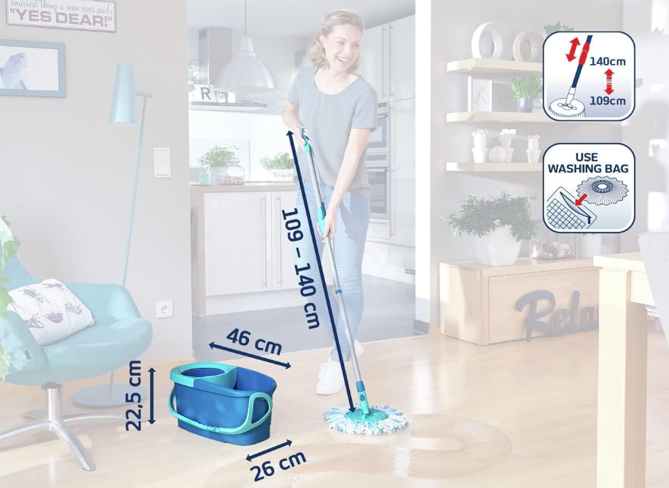 • Product details - Leifheit Clean Twist Disc Mop Ergo Mop and Bucket. Mop with patented in-handle spin. Handle adjustable to 130 cm. 20 L capacity. Bucket size - 46.6 x 34 x 26 cm. Item no. - 52101