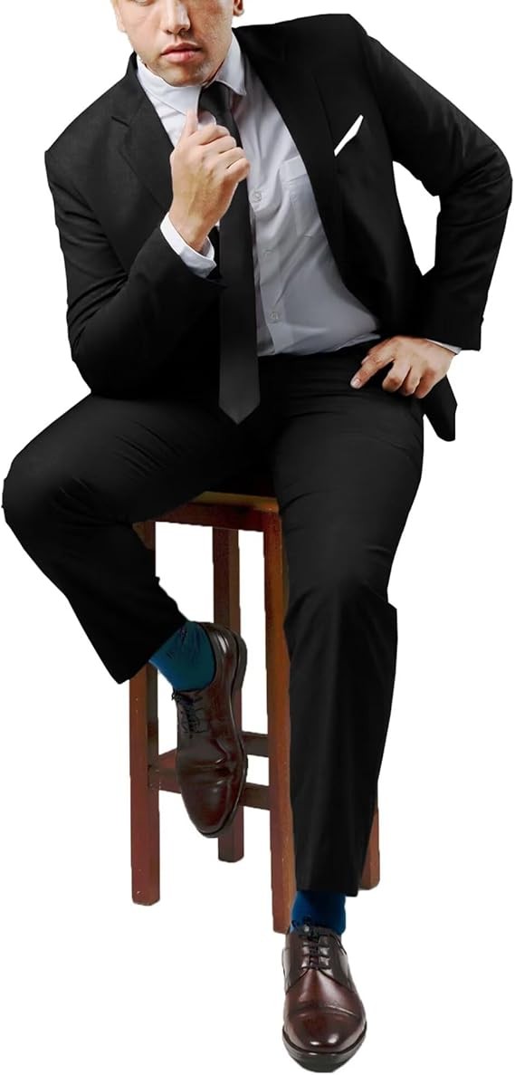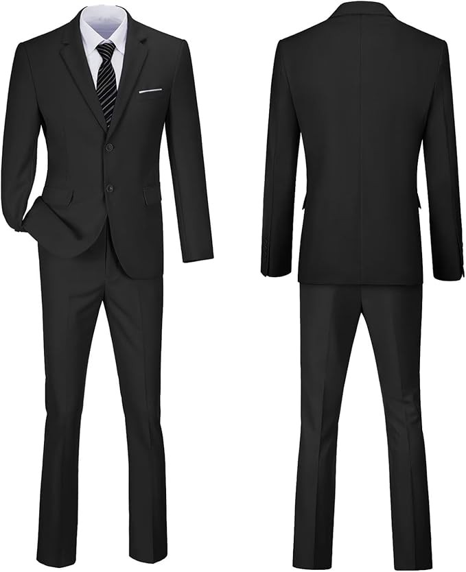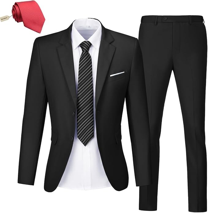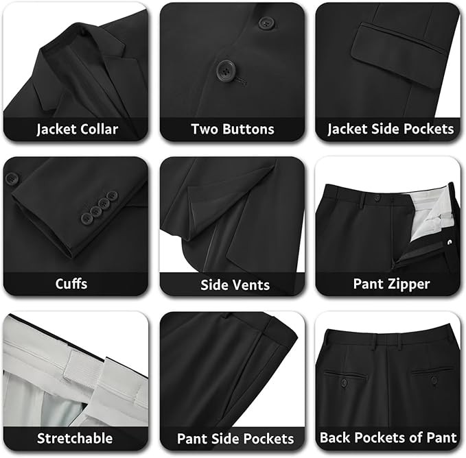 • What You Get : You'll get suit jacket*1, pants*1 and tie*1. The suit jacket is single-breasted with 2 buttons.Flat Front Design Suit Pants with Elasticated Bands, Two Slant Pockets and Two Back Pockets.