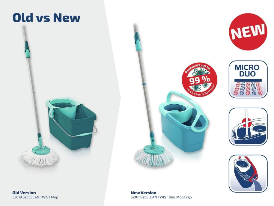 • Product details - Leifheit Clean Twist Disc Mop Ergo Mop and Bucket. Mop with patented in-handle spin. Handle adjustable to 130 cm. 20 L capacity. Bucket size - 46.6 x 34 x 26 cm. Item no. - 52101